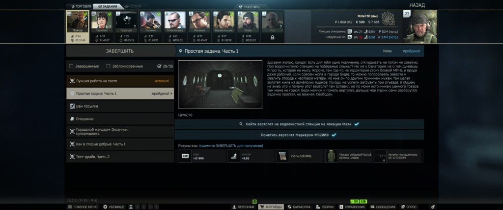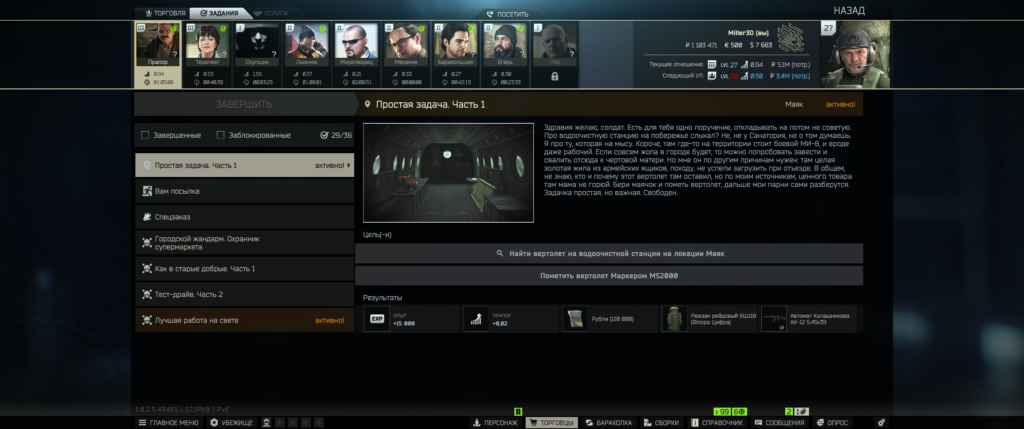 Сдаем квестик и получаем 15000 тыс. опыта, репутацию с Прапором повышаем на 0.02+, 120т.р. рюкзак самый большой в таркове 6Ш118 и калаш 12