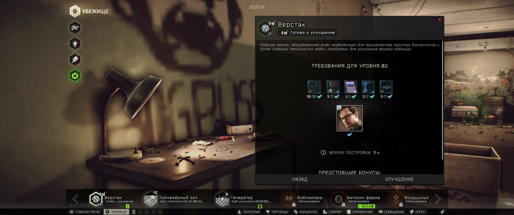 Верстак — это «технический» модуль, который открывает путь к другим улучшениям. Для его строительства и апгрейда нужны дефицитные предметы (например, Set of files Master, Toolset), что само по себе является мини-квестом .