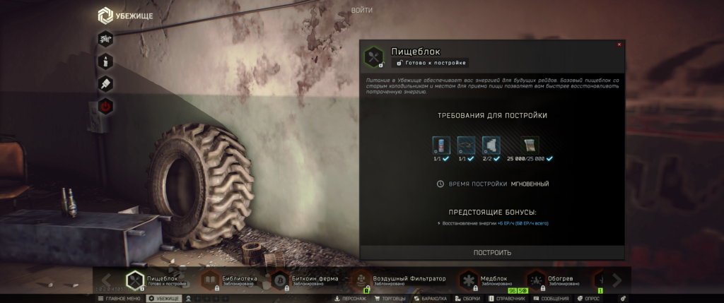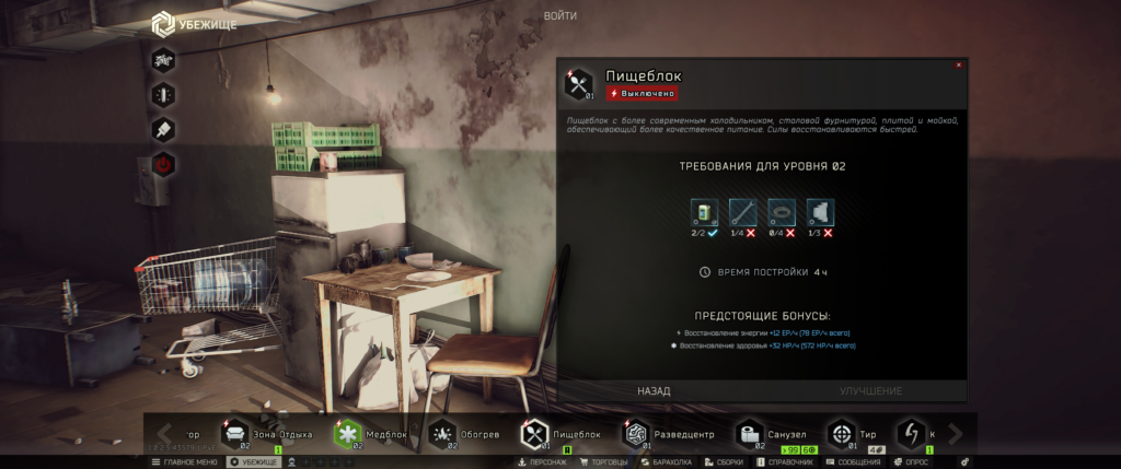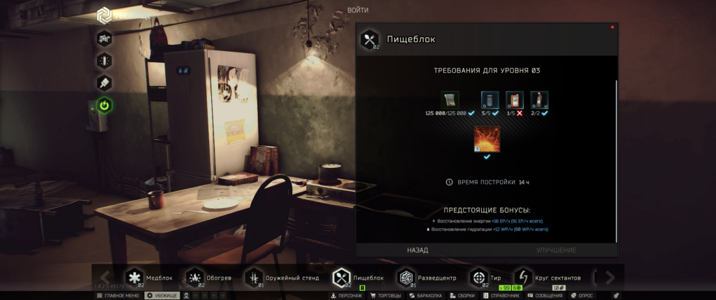 Последнее требование особенно важно: навык «Метаболизм» нужно прокачать до 3 уровня, чтобы построить пищеблок 3 уровня . Метаболизм прокачивается употреблением еды и напитков непосредственно в рейде, а не в убежище .