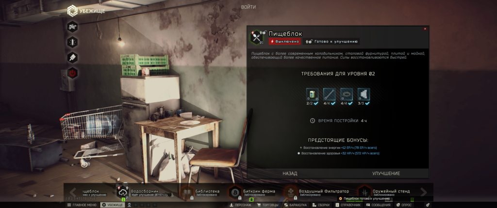 4. Синергия с другими модулями: Пищеблок завязан на работу водосборника, санузла и самогонного аппарата. Прокачав его, вы запускаете цепочку прибыльных крафтов.