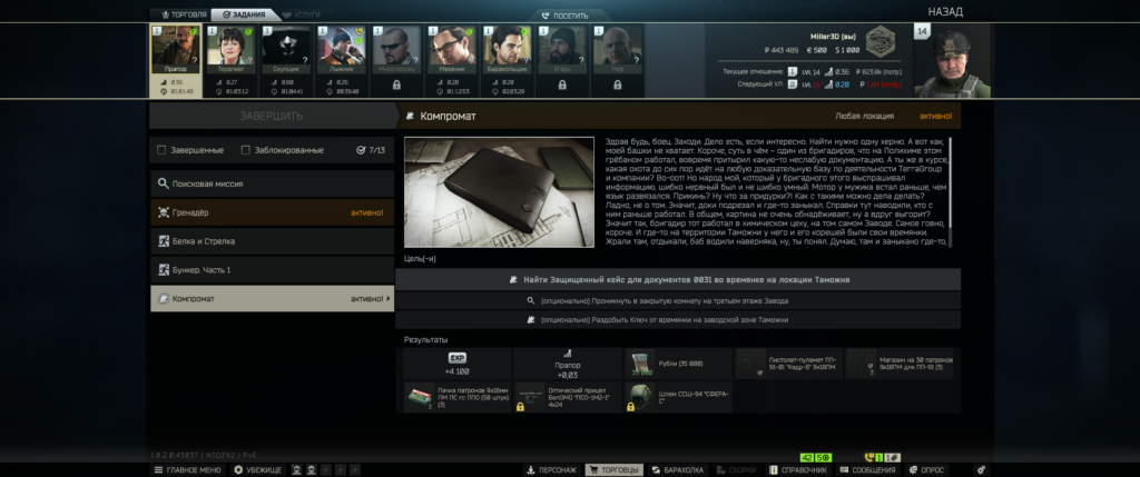 По открытию квеста: раньше были жалобы, что после «Нефтянки» он не открывался, но сейчас всё стабильно. У меня лично открылся без проблем, лвл не важен — у кого-то на 15, у кого-то позже. Если квест есть в списке — идёте и забираете папку способом выше.