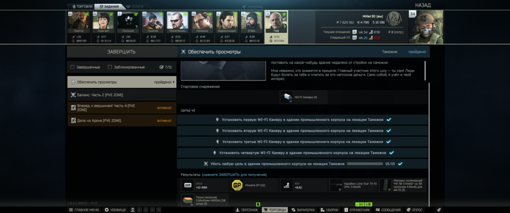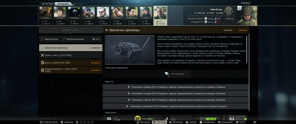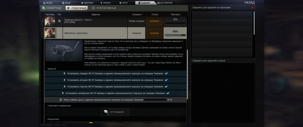 Реф выдаст камеры возьмите с собой на барахолке дорого их покупать если потеряете. Камеры можно поместить в спец слот и подсумок. Идем на таможку Вам сначала нужно установить 4 WI-FI Камеры в здании промышленного корпуса около жд по всем зданию будем бегать возьмите фонарик боты там бывает появляются, а затем убить внутри этого здания 15 любых целей. В любом случае как камеры повесите Вам надо будет там настрелять 15ть ботов.