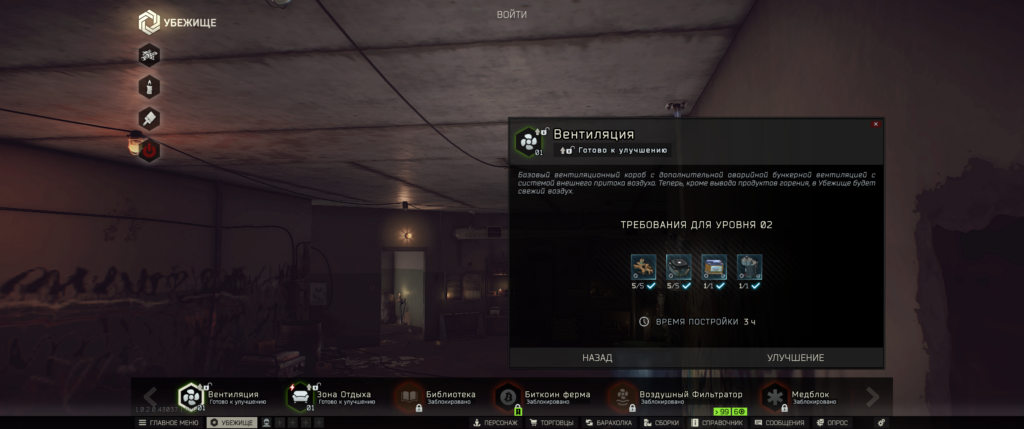 Вентиляция имеет три уровня прокачки. Для строительства требуются ресурсы, большинство из которых должны иметь статус «Найдено в рейде».